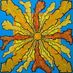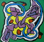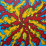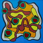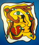 2002Acrylverfschilderij. Kleuren: Hemelsblauw, rood, geel, oranjegeel, lichtgroen, zwart.
