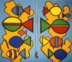 1993Vissen die wegzwemmen van een vislijn met een worm eraan. Acrylverfschilderij in smalle zwarte lijst. Kleuren: Hemelsblauw, oranjegeel, geel, wit, blauw, groen, rood, oranjebruin.